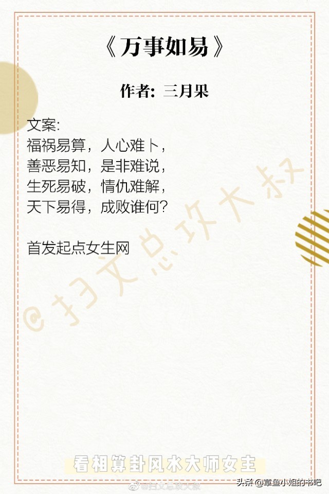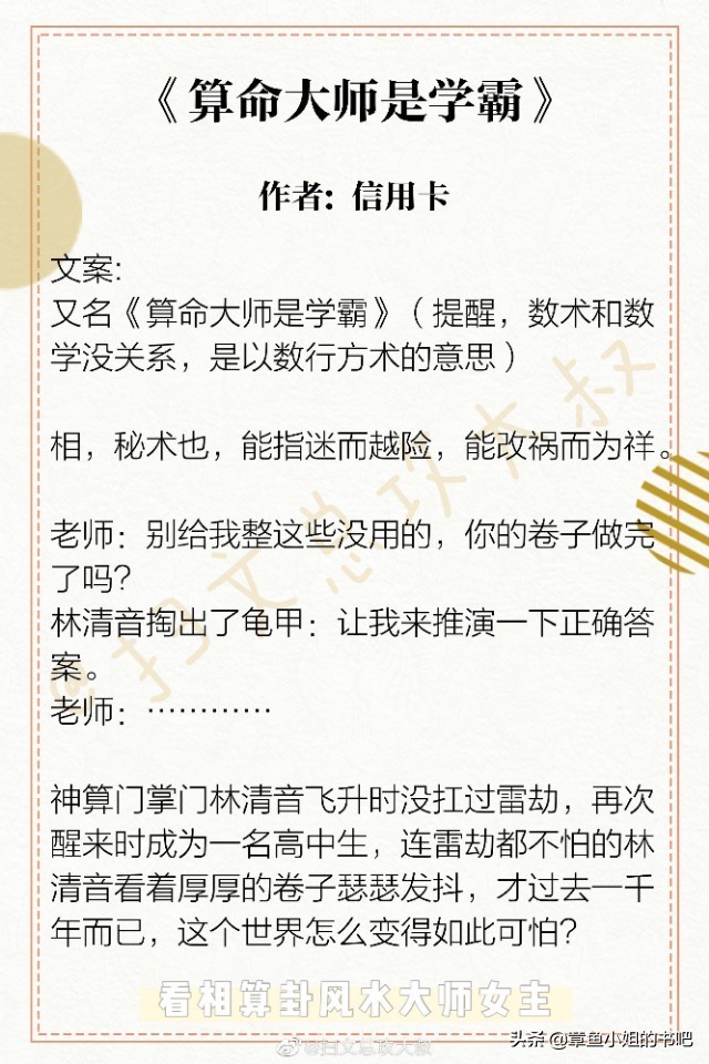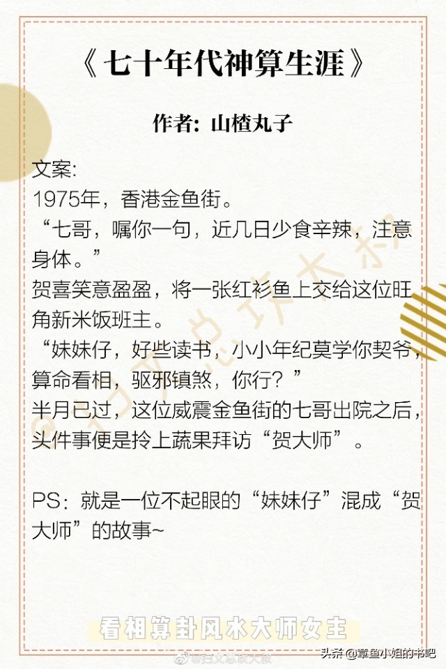 今天,给大家推荐几本看相算卦风水大师的女主文。你有去路边小摊上算过一卦或者看过手相吗!
