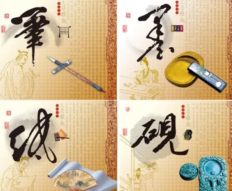 提到calligraphy,就不得不提到中国的文房四宝:the four treasures of study。study作为名词是书房的意思。文房四宝分别为笔,墨,纸,砚。