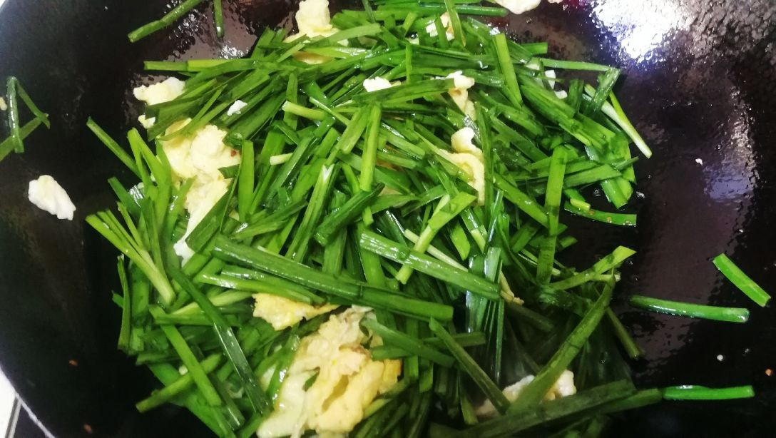 韭菜事先切成段,待鸡蛋炒熟后把韭菜倒入锅内,大火翻炒,防止把韭菜炒的过软,出锅前倒入炸好的烧饼,翻炒两下出锅装盘。这样好吃的韭菜烧饼炒鸡蛋就完成了。