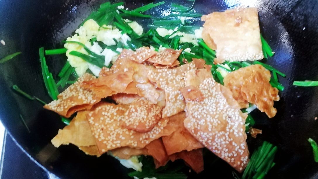 韭菜烧饼炒鸡蛋,烧饼酥脆鲜香,吃了一次还想吃,大人孩子都喜欢