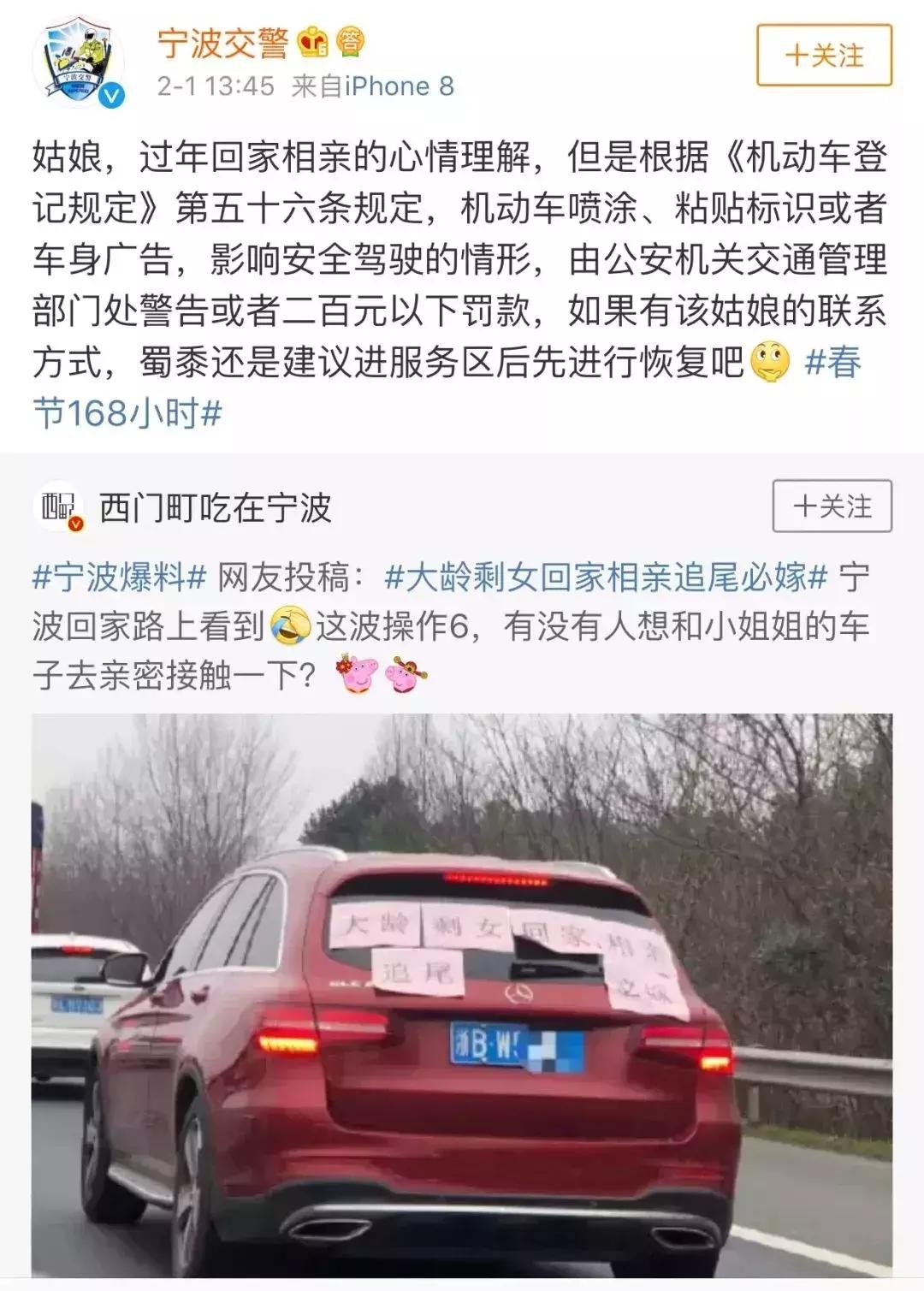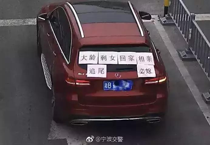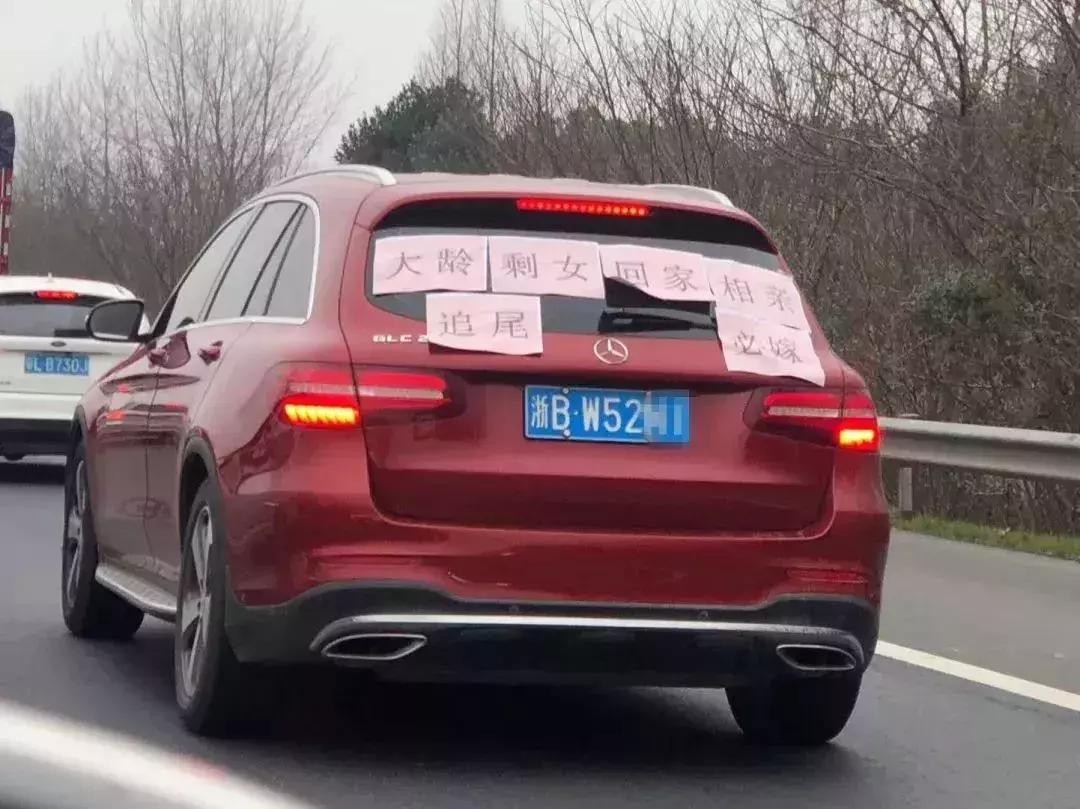2月1日,浙江宁波一辆“浙BW52**”奔驰车火了!在汽车后窗上,车主贴着:大龄剩女回家相亲,追尾必嫁!
