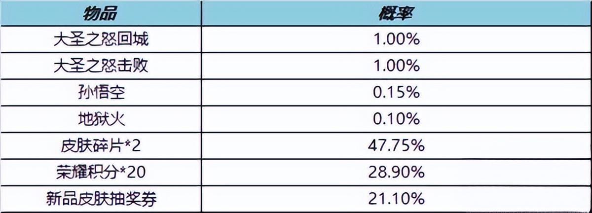 而说到获取概率,王者荣耀斗战胜佛礼包概率是大圣之怒回城概率1%、大圣之怒击败概率1%、孙悟空概率0.15%、地狱火概率0.1%、皮肤碎片*2概率47.75%、荣耀积分*20概率28.9%、新品皮肤抽奖券概率21.1%。