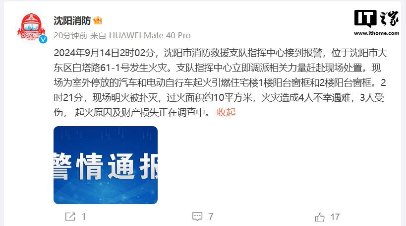IT 之家 9 月 14 日消息,据沈阳消防通报,2024 年 9 月 14 日 2 时 02 分,沈阳市消防救援支队指挥中心接到报警,位于沈阳市大东区白塔路 61-1 号发生火灾。支队指挥中心立即调派相关力量赶赴现场处置。