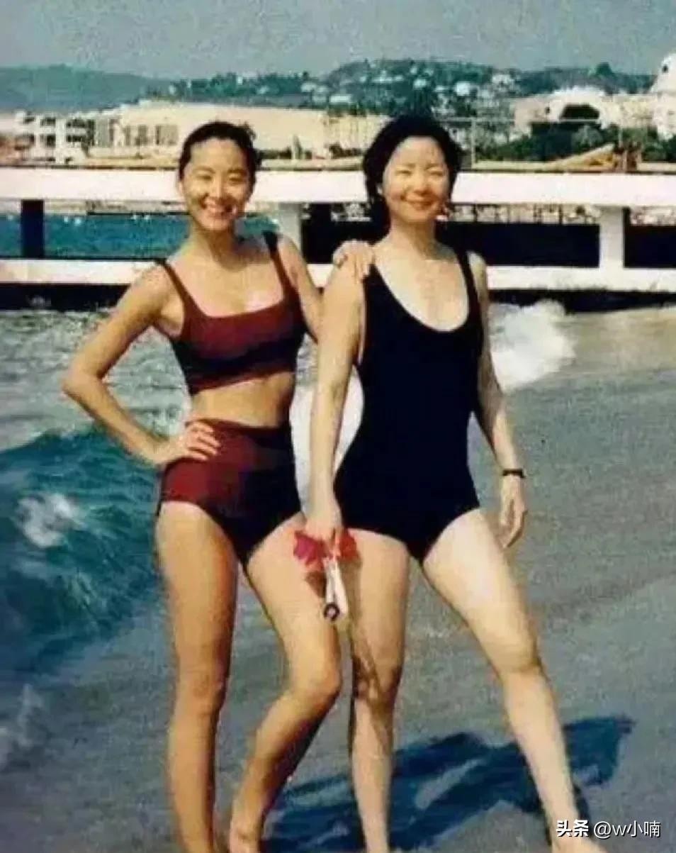 2.1990年老照片,林青霞和邓丽君的沙滩照1990年,法国沙滩,36岁的林青霞和37岁的邓丽君。