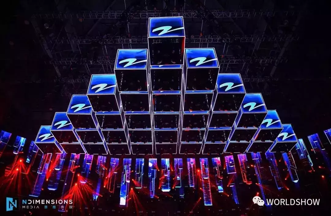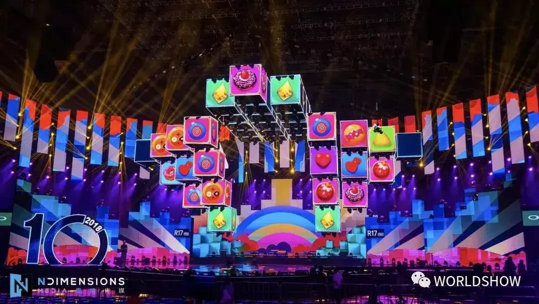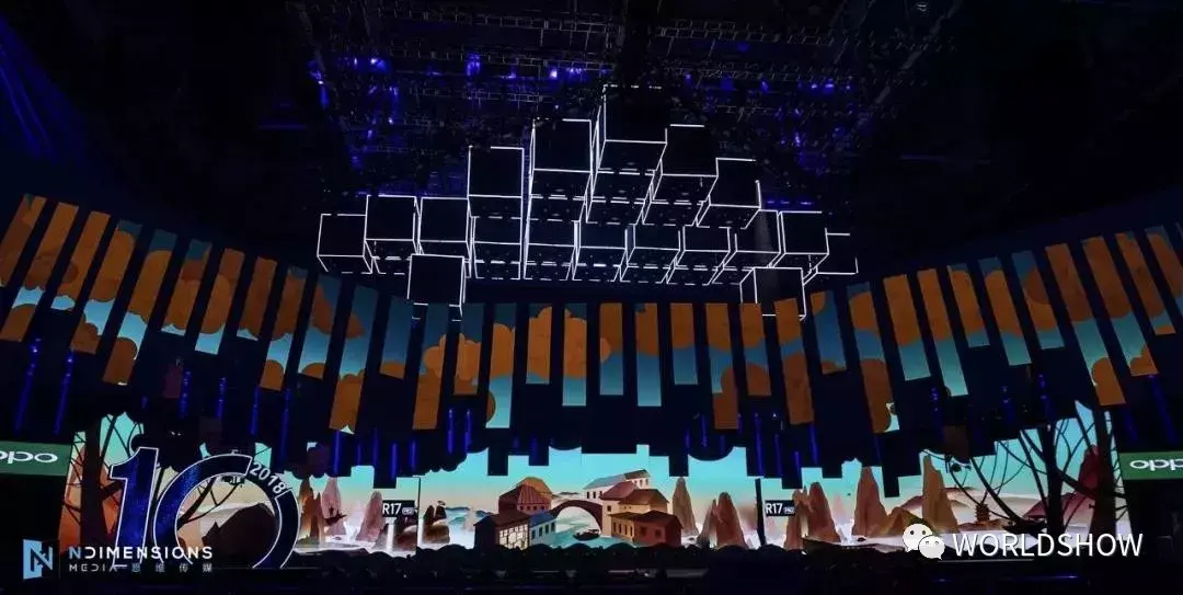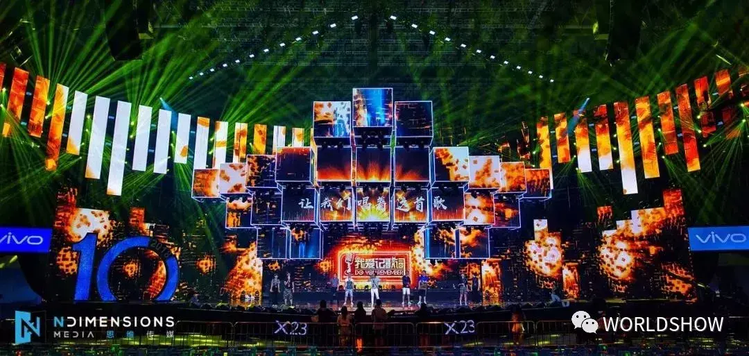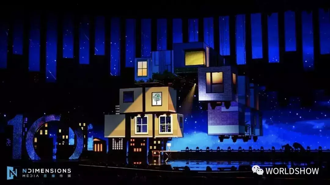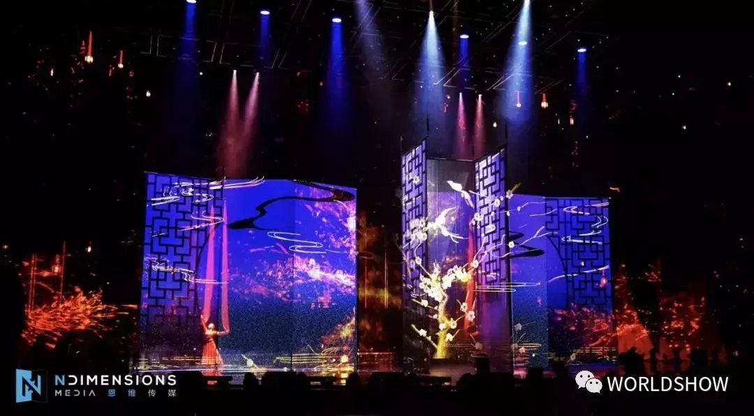 此次晚会通过开合主屏、地屏、上下条形彩幕,以及空中36组LED盒子矩阵作为基础视觉造型载体。根据不同节目设计需求,辅以雾化膜、巴厘纱投影和道具设计、LED盒子造型包装,带来不同的视觉格局和张力。