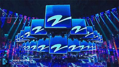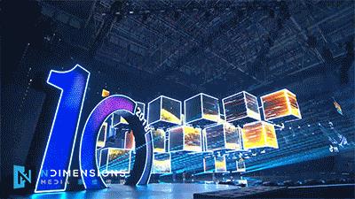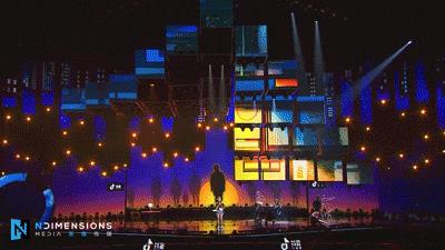 空中36组LED盒子矩阵可升降,在视觉设计中把升降动线、造型作为设计整体的组成部分,给舞台带来丰富动态变化。开场《希望就在前方》利用盒子升降形成视觉拼图式的呈现,变换不同造型,表现歌词、各种照片场景回顾。