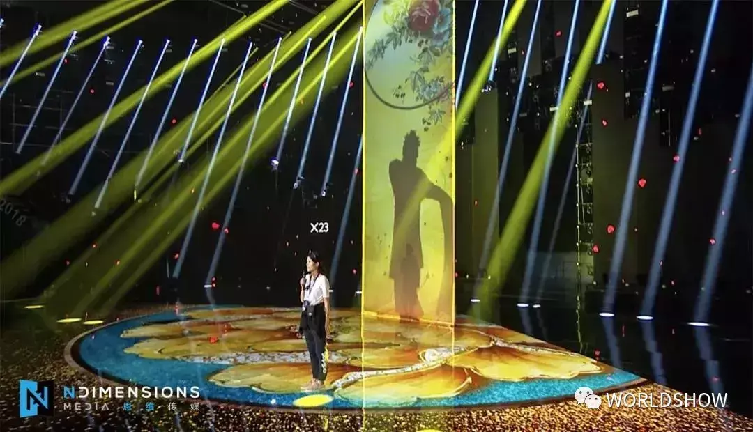 视觉设计综合画面和呈现形式考虑,以投影和不同质感载体的结合,打破舞台原有台型布局。于毅和王珮瑜《传奇+牡丹亭》,中央一道雾化膜搭配4台投影及膜后灯光,实现影子舞创意。