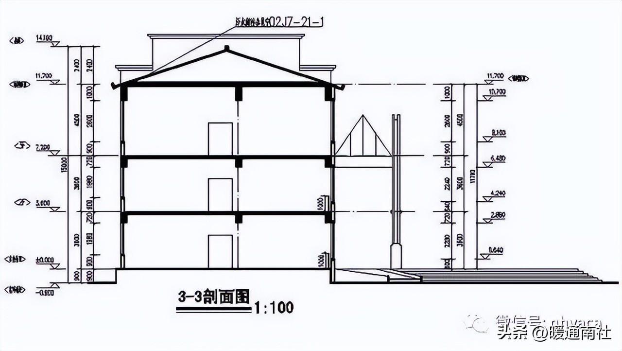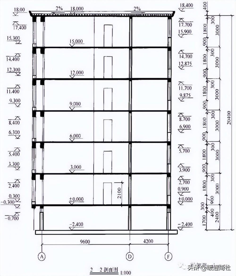 在剖面图中,应注出垂直方向上的分段尺寸和标高。