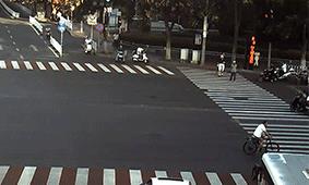 路口处,一辆电动自行车见南北方向绿灯直行的车辆不多,于是便沿东西向路段闯红灯横穿马路,在骑过道路中间隔离栏时,白色轿车发现电动自行车后,立即制动没有撞上,但旁边车道的棕色轿车因左侧有白色轿车挡住了驾驶人的视线,等看见横穿马路的电动自行车时,虽已采取紧急制动,但两车还是发生了碰撞,导致电动自行车上两人受伤。交警部门认定闯红灯的付某负事故全部责任。
