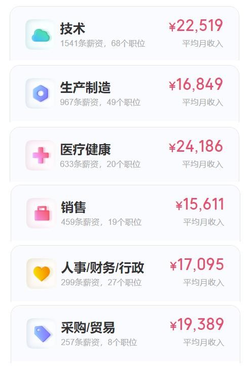 我们看一下不同岗位的平均月收入情况:技术人员平均月收入22519元,生产制造人员平均月收入16849元,医疗健康人员月平均收入24186元,人事/财务/行政人员平均月收入17095元,销售人员平均月收入15611元,采购贸易人员平均月收入19389元。