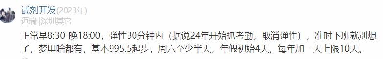 迈瑞医疗员工口述:正常早8:30-晚18:00,弹性30分钟内(据说24年开始抓考勤,取消弹性),准时下班就别想了,梦里啥都有,基本995.5起步,周六至少半天,年假初始4天,每年加一天上限10天。