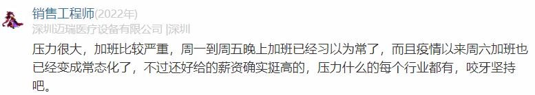 迈瑞医疗员工口述:压力有点大,工作会不停的有部门领导催,但实际工作进度不快,碰到好的领导和部门工作相对轻松,压力也就没那么大。
