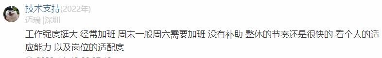 迈瑞医疗员工口述:工作节奏快,很少准时下班,一般周六必须加班,因为要开会,周六加班能调休但没补助,有些部门领导可能要求比较松,不怎么加班的话还算是不错的,所以要跟对领导,进对部门。