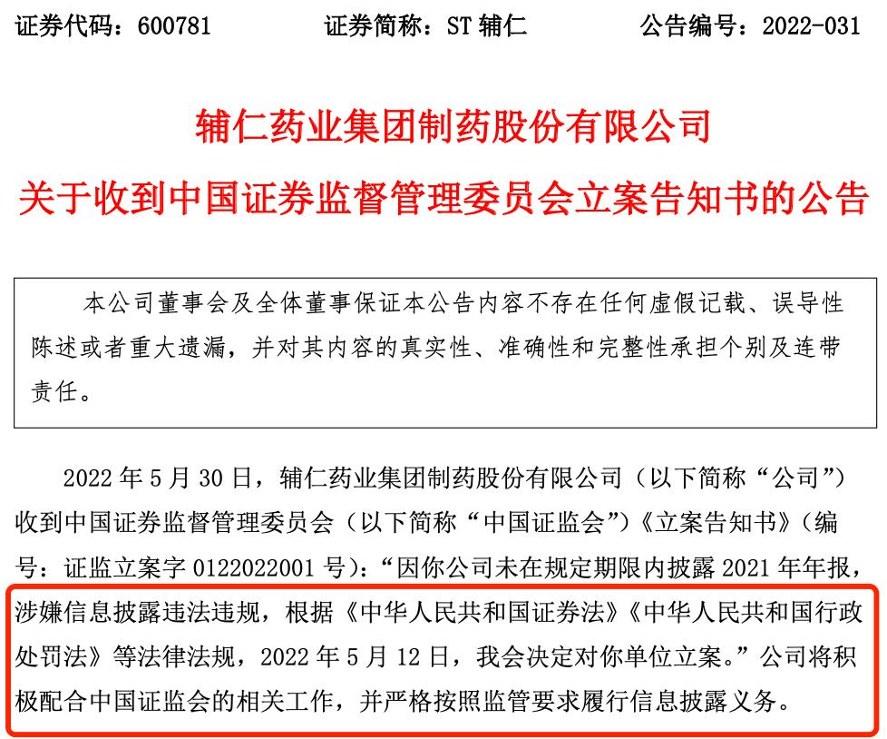 近日,一则公告让本就不稳定的股市波动得更厉害,证监会表示,由于辅仁药业迟迟不公布2021年和2022年一季度财报,将其对其调查。众人的眼光也立即拉回辅仁药业身上,它究竟怎么了?