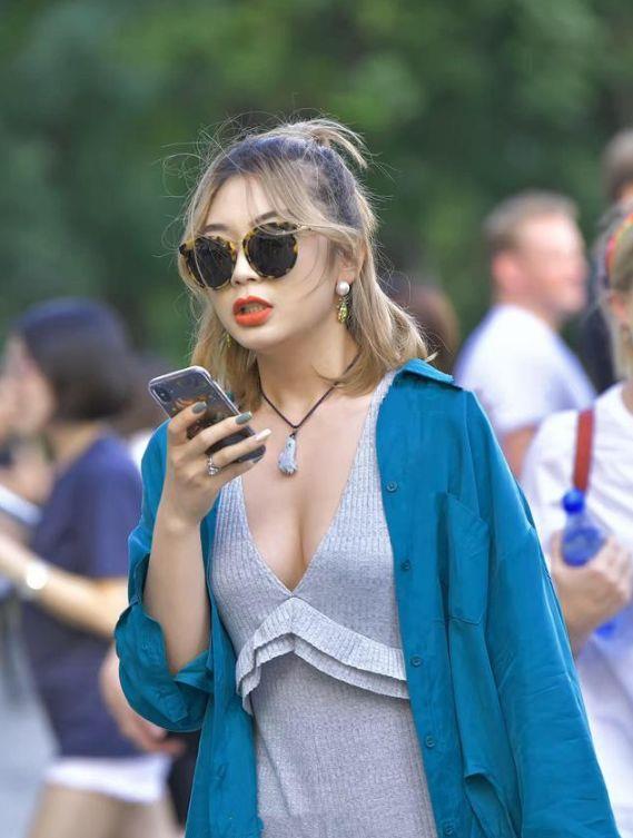街拍:图5美女身穿蓝色外套,内搭低胸连衣裙,傲人身姿很吸睛!