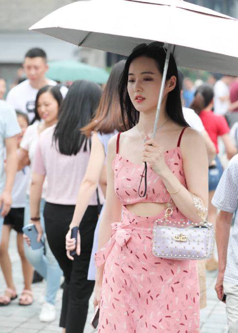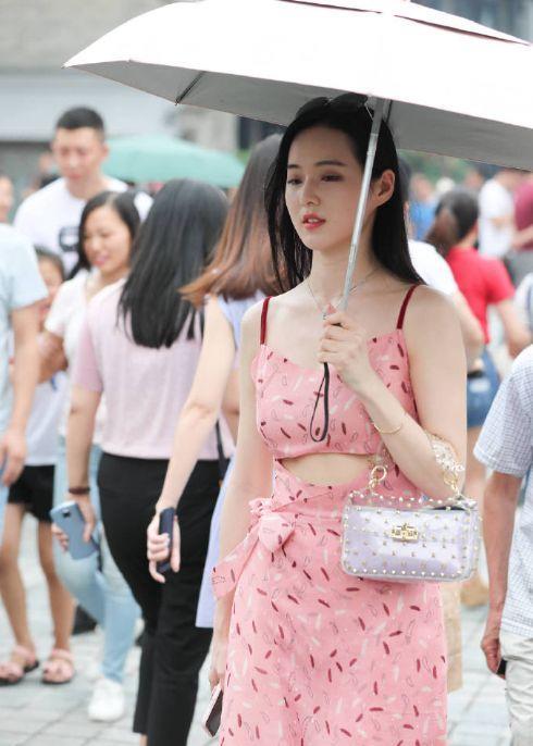 街拍长发美女,一袭粉色套装,吊带上衣尽显肤白貌美的气质,魅力十足
