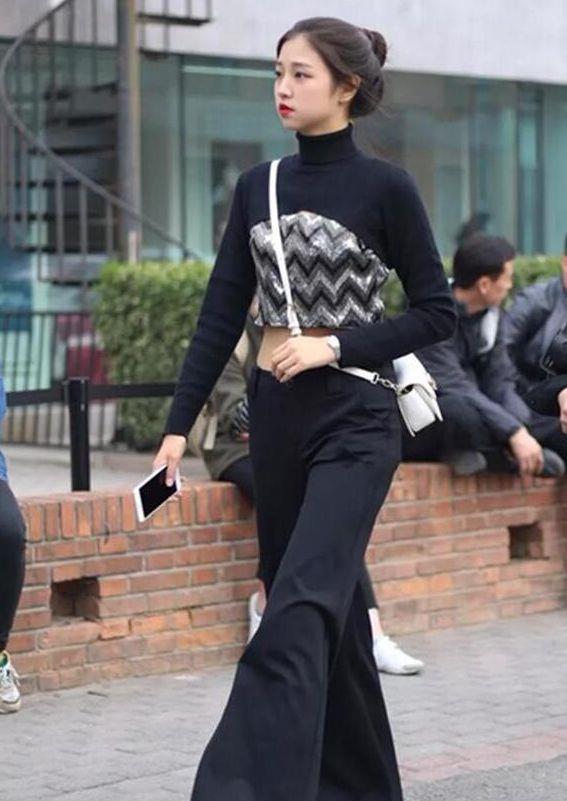 气质美女身穿半高领露脐上衣,下面穿黑色长裤,成熟美女的魅力不可抵挡