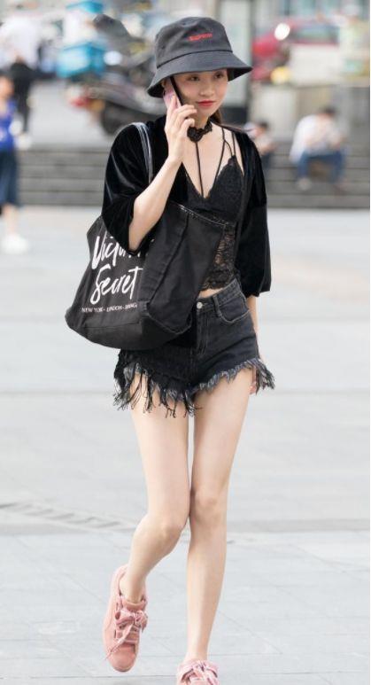 头戴渔夫帽,黑色蕾丝吊带搭黑色短裤,秀出性感火辣的好身材