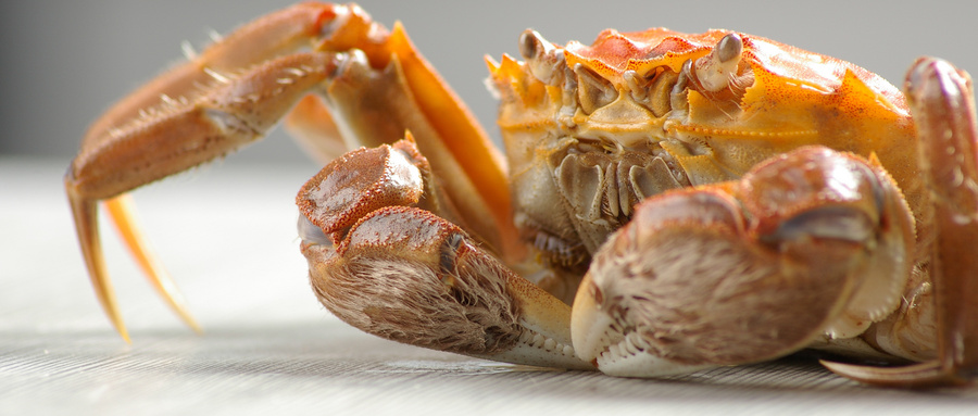 2、螃蟹左右边的边缘是其最脆弱柔软的部位,可以靠着桌子的边缘借力剥开螃蟹的外壳。