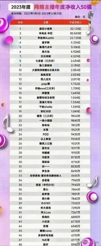 2023年主播收入排行榜,前三名远超20亿,实则为假消息!