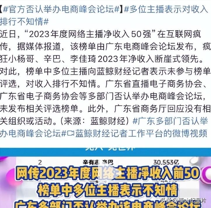 近日网络曝出某收入排行榜单,显示2023年主播收入排行榜,前三名远超20亿!官方否认举办电商峰会论坛!有人说,中国网络主播千千万,真正赚钱的又有几个?
