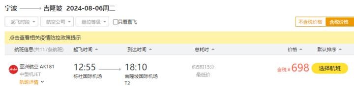 记者查询到,目前预订8月份宁波飞往吉隆坡的机票,单程含税票价在800元至1000元左右,最便宜的是8月6日,票价为698元。如果选择飞亚庇,8月份单程含税票价800多元,其中最便宜的是8月9日和8月11日,票价为532元。
