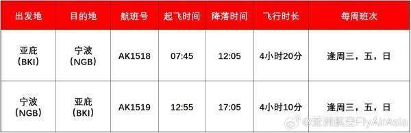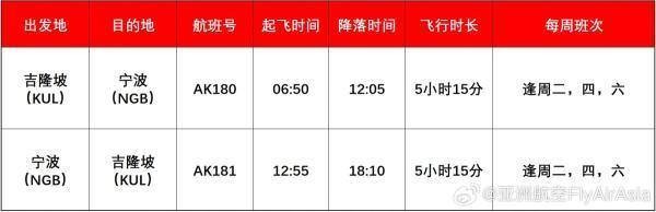 近日,亚洲航空正式宣布8月1日开通宁波直飞吉隆坡航线,8月2日开通宁波直飞亚庇(沙巴)航线。两条全新航线均由马来西亚亚洲航空公司运营,由每周二、四、六从宁波定点飞往吉隆坡,每周三、五、日定点飞往亚庇(沙巴)。新航线将利用两国间的免签政策,促进中国与马来西亚之间的旅游和商务交流。