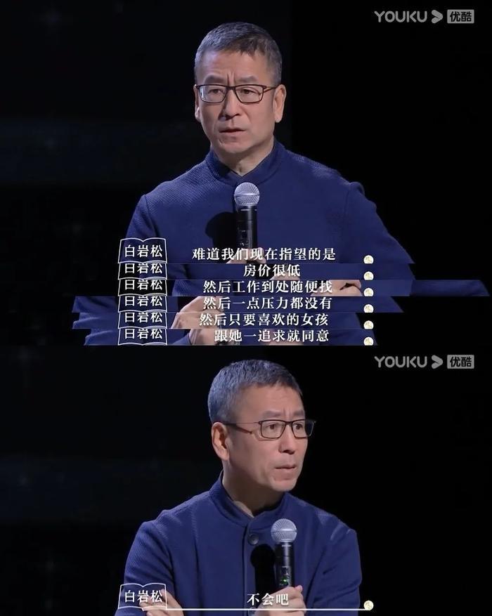 在男青年离开舞台之后,他说道:“难道我们现在指望的是房价很低,然后工作到处随便找,然后压力一点都没有,然后只要喜欢的女孩,跟她一追求就OK,不会吧?”