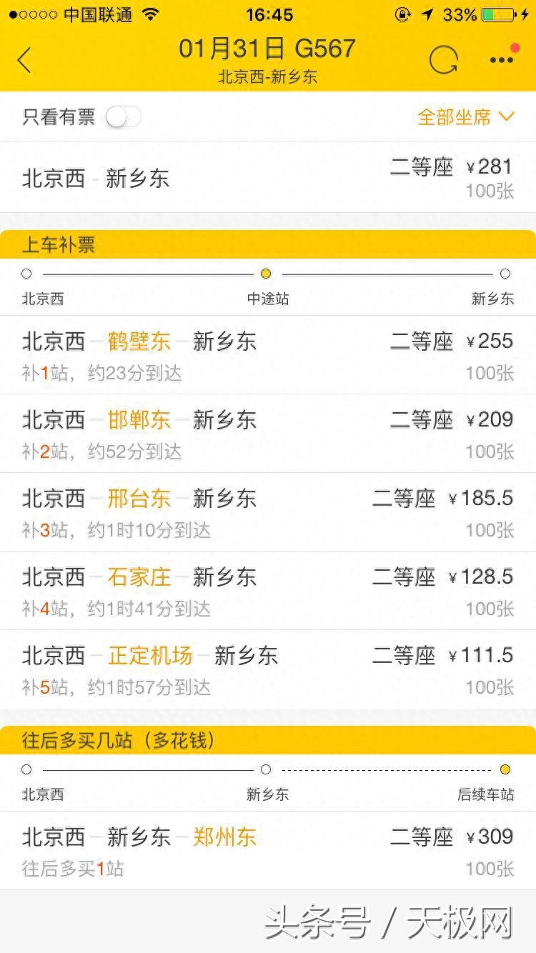 为了能上车,先买一站的商务座,上车再补票;大不了多买几站,能回家就行……诸如此类的“投机”方法,大家一定都听说过,也有不少尝试过的,但是这么多趟车这么多站一个个去查的时间恐怕就要全部错过了,这点上飞猪就比较人性化了,当你购买的区间没票的时候,飞猪上可以看到这趟车所有区间的票的剩余情况,大家可以根据实际选择购买。