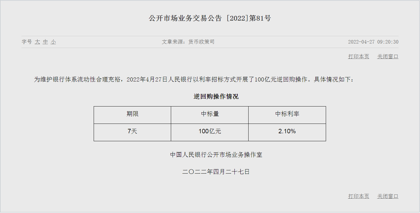 2022年4月27日人民银行以利率招标方式开展了100亿元逆回购操作。中标利率为2.10%,与此前持平。
