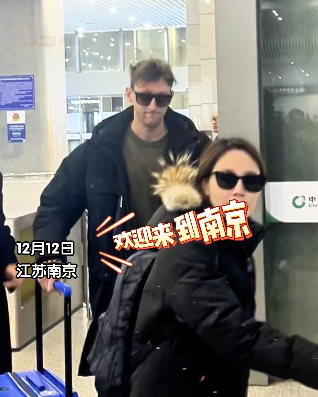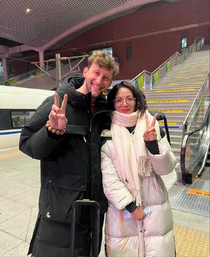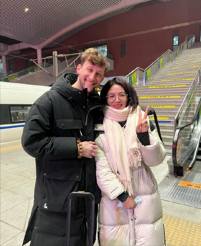 身着黑色长款羽绒服,仿若本地人一般。