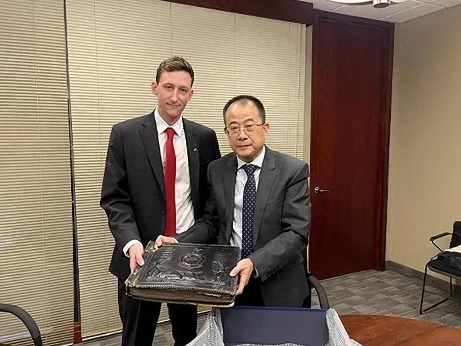 埃文系上寓意吉祥的红色领带,踏上前往领事馆无偿捐赠相册之路。