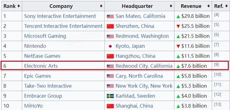 EA全球游戏收入第6