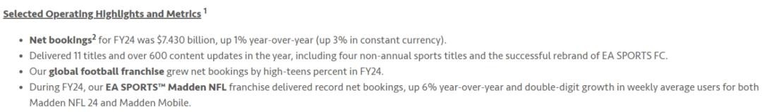 此外《EA Sports FC 25》也于9月发布,配合推出的《FCMobile》和《FCOnline》,使得该系列的全球玩家人数激增了超过130%。不过《Apex英雄》在本季度则遇到了一些挑战,第22赛季的表现并未达到预期,净预订量也低于预期,由此,CEO Andrew Wilson也拒绝了推出续作《Apex英雄》2.0的提议。