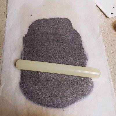 12、将面团放在两张油纸中间,擀成3mm的薄片,连油纸一起装入烤盘,放入冰箱冷冻1小时。