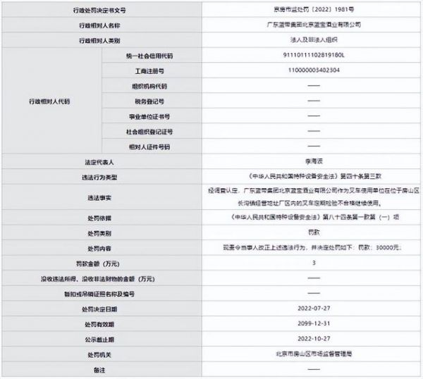 中国经济网北京8月3日讯 近日,北京市市场监督管理局发布行政处罚决定书(京房市监处罚〔2022〕1981号)。经调查认定,广东蓝带集团北京蓝宝酒业有限公司作为叉车使用单位在位于房山区长沟镇经营地址厂区内的叉车定期检验不合格继续使用。上述行为违反了《中华人民共和国特种设备安全法》第四十条第三款的规定,根据《中华人民共和国特种设备安全法》第八十四条第一款第(一)项的规定,北京市房山区市场监督管理局现责令当事人改正上述违法行为,并决定处罚如下:罚款:30000元。