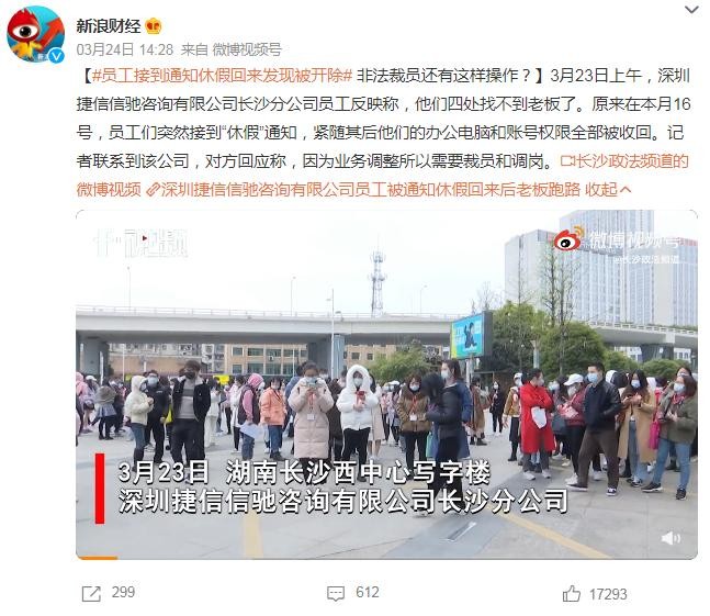 而今年年初,深圳捷信信驰咨询有限公司长沙分公司大量员工向长沙电视台反映,突然接到3月12日开始“休假”的通知,办公电脑及账号权限被收回。随后,与捷信相关联的“员工接到通知休假回来发现被开除”词条登上微博热搜,阅读量一度高居不下。