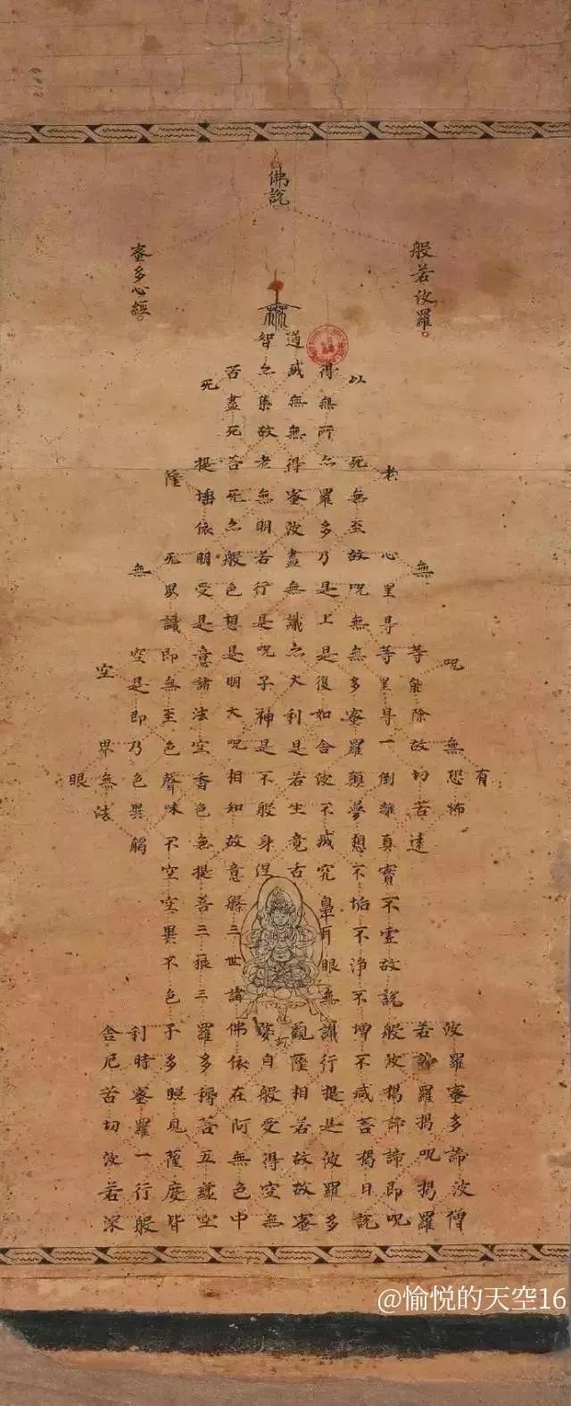 《宝塔心经》是把佛经中的《心经》以塔的形状书写出来。这种塔状的心经分为塔座﹑塔身和塔顶三部分,而塔身又分为五层,塔顶为经文题名,塔门绘有观世音菩萨立像,解读宝塔心经的方法是从观音菩萨左足下角的“观”字开始,沿虚线依次读之,最后心经结尾“婆诃”是收在观世音菩萨的右足下角。现整个敦煌文献中,有关宝塔心经的写本只有四件,于1906年流失,现藏于法国国家图书馆。