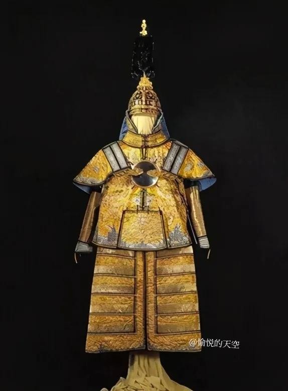 这件盔甲是清乾隆大阅甲胄。甲胄有上衣、下裳、护肩、护膝、袖、裆等部分组成。不管是甲胄的用料还是做工,甚至装饰都是一等一的好在宫中上百上千个,手艺精湛的服饰匠人耗费上万多个小时制作成的。甲胄使用的是皇帝专用的明黄绸缎,衣服上绣有五彩多云、金龙纹、海水江崖等图案。华贵的装饰,考究的用料,精细的做工无不让人赞叹。甲胄有个特点就是轻如棉袍,刀枪不入。像棉袍那样的轻巧,保暖等级还高。不管什么样的武器,只要穿上它,都能化险为夷,类似当今的防弹衣。它能刀枪不入,主要得益于,特殊的材质和巧妙的做工。胄,是用牛皮胎髹黑漆制成,甲面有规则的金帽钉,衣正中是有面钢质的护心镜。世间仅存一件,于1860年流失,现藏于法国国家军事博物馆。