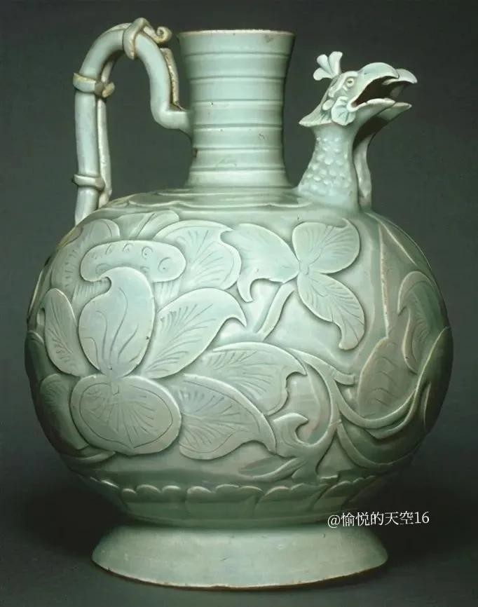 此器高20.5厘米。釉质青润,壶身雕刻缠枝牡丹纹,开花大叶,蓬勃饱满,尚存唐代遗风。造型优美协调,以壶嘴为凤头,竹节装凤尾壶执,壶腹围牡丹纹,将“凤穿牡丹”的寓意表达得淋漓尽致。于民国时期流失,现存于法国巴黎吉美博物馆。
