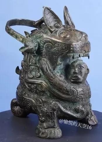 此器高35.2厘米,造型是一只老虎张开嘴巴正在吃人,上方有一个提手,并雕刻有云雷纹。盖上有一个小鹿,活泼可爱。老虎的尾巴和两个爪子构成三角鼎立。老虎的尾巴和两个爪子构成三角鼎立。虎耳和虎身布满云纹,还有两个有神的圆眼睛,锋利的牙齿。现世界上仅存两件。此品于1920年流失,现藏于法国巴黎赛努奇博物馆。