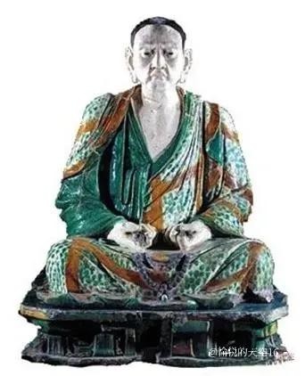 这尊123厘米高、手持佛珠、庄严沉思的罗汉塑像,实属罕见。其表情专注安宁,惊觉而刚毅。这组辽代等身三彩罗汉像出自河北易县八佛洼,目前这组辽三彩罗汉像世上仅存11尊,这尊现藏于法国吉美博物馆。