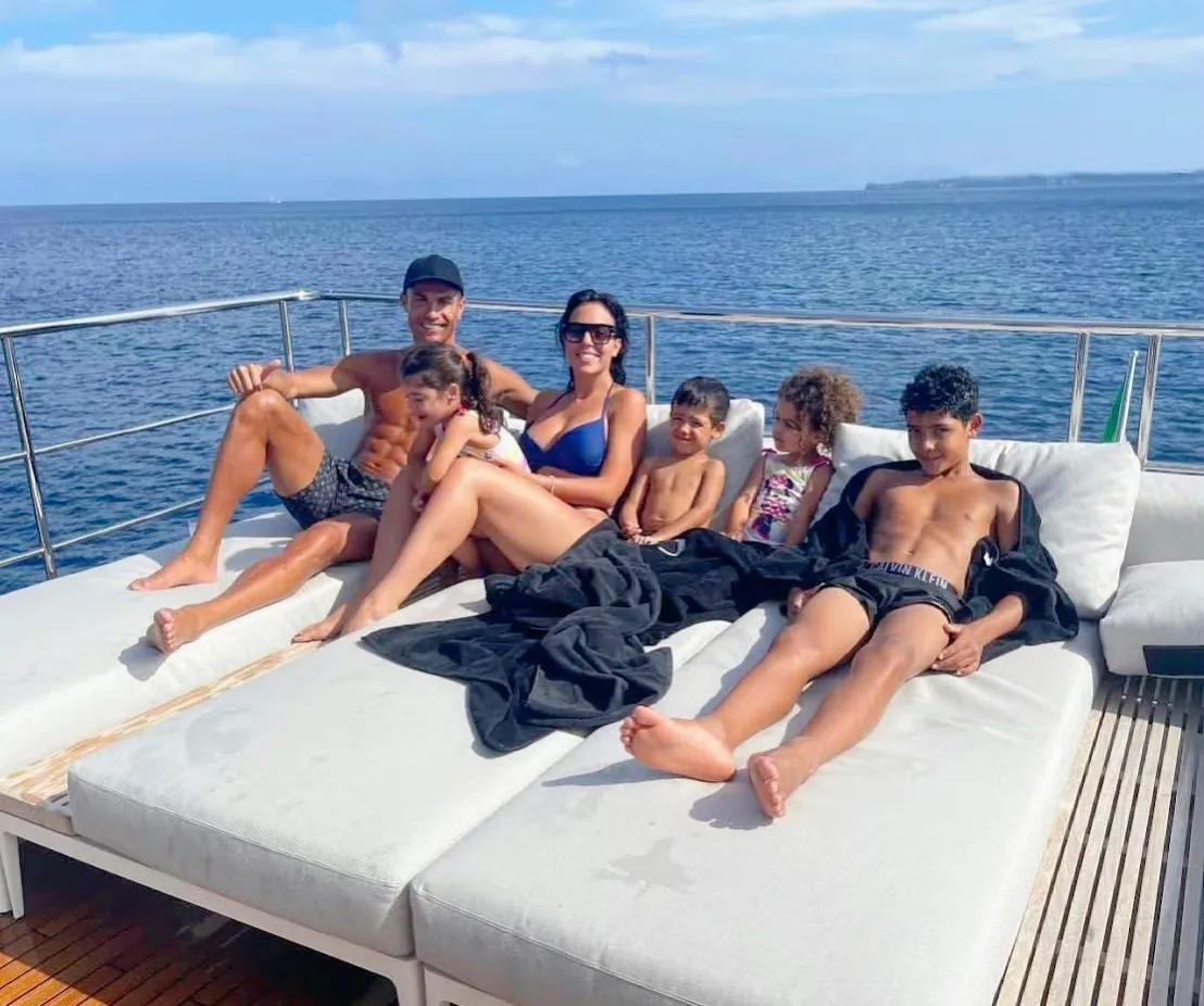 C罗有空就带着家人和孩子出海游玩度假,整整齐齐的一排一家人。