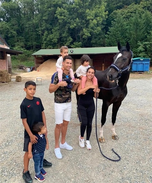 C罗带着一家人去骑马游玩,夫妻俩把孩子顶在肩膀上超级享受度假时光。
