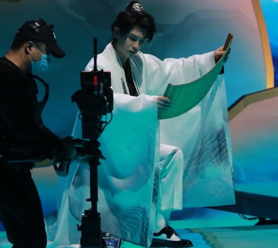 我们先来看看黄明昊,在这张照片中,黄明昊拿着竹简,颇有架势。但是,可能因为大家看惯了他的现代装,这个造型看起来好像有点违和感。