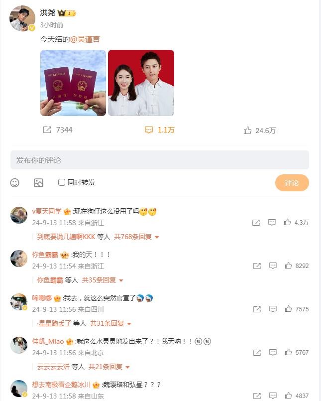 他们各自分享了他们的结婚证照片,并分别配以温馨的文案——“今天领的”,“今天结的”,公开了这段美好姻缘。