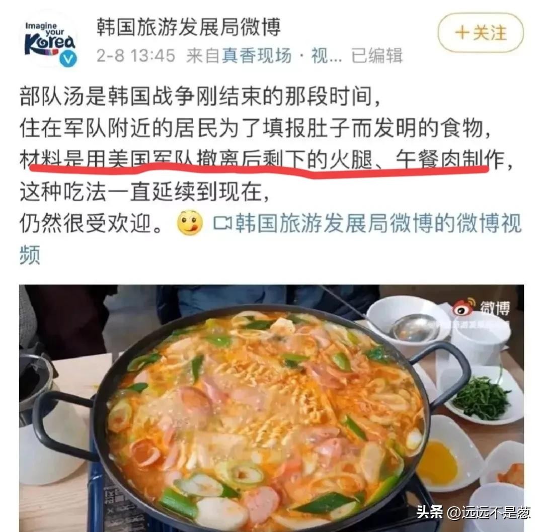 本来吧,这个部队火锅这事儿也没有啥,当年那情况谁都是为了生存活下去。不过韩国近年来这个文化输出做的实在是太没边儿了,因为至于自己都看不下去了,自己揭露这部队火锅就是拿的美军的剩菜剩饭做的,没毛病!