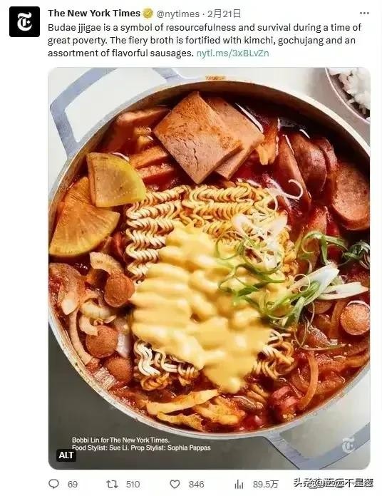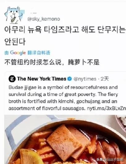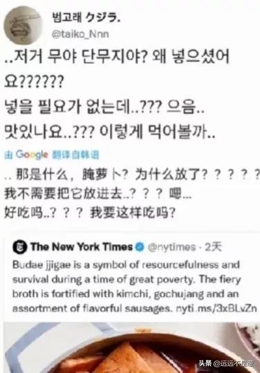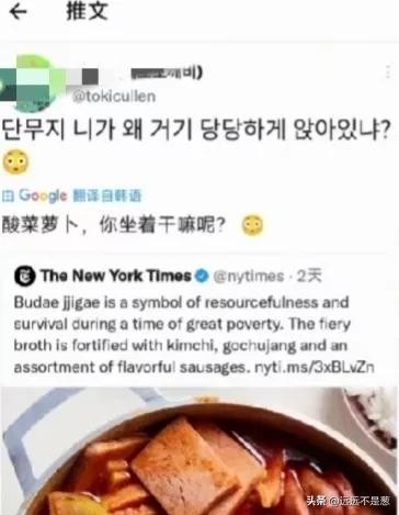 虽然《纽约时报》发布这条推文之后,有一些韩国网友认为这个发文是种族歧视的表现,许多国外网友对此也打抱不平,但是,更多的韩国网友却纠结于发文中的部队火锅为什么要加腌萝卜?表示这个部队火锅做的不正宗,类似这种食谱纠错的贴文是层出不穷啊。对此表示韩国人的脑回路很清奇啊,怎么的,这个用剩菜剩饭做的部队火锅,感情是吃上瘾了,越吃越上头!