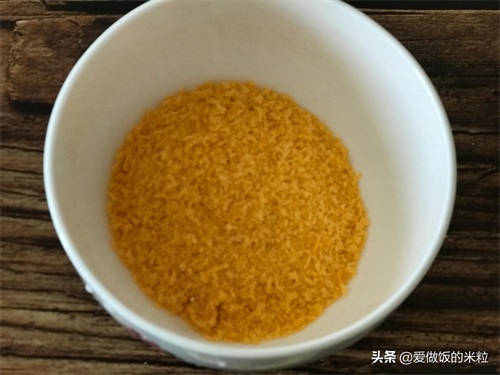 再把面包糠倒入小碗中,面包糠最好买那种黄色的,炸出来颜色更好看。