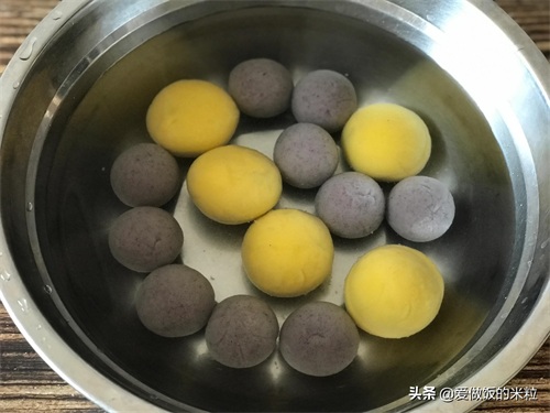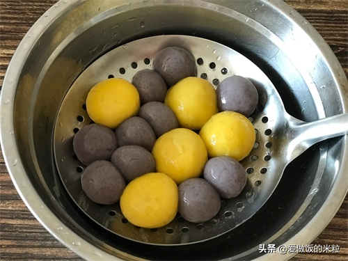 ③、把煮的汤圆捞出来,放在一盆凉水中。这样能使汤圆迅速降温,防止汤圆粘连在一起。